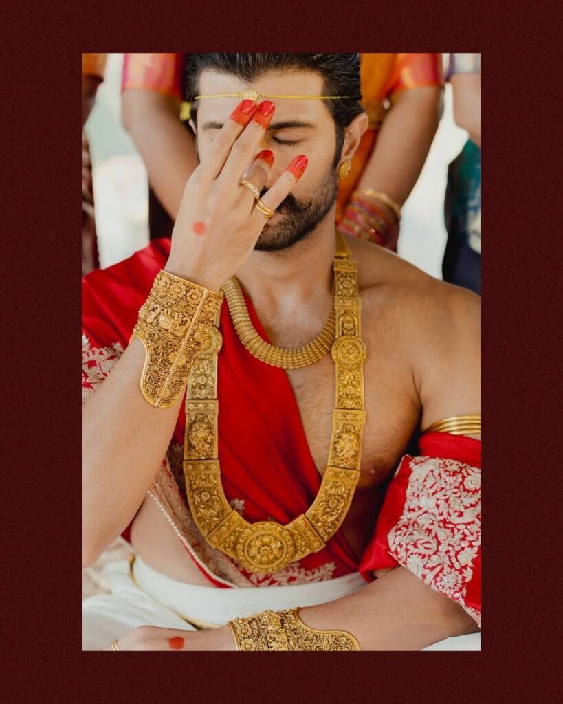 Unlike heavily accessorized grooms, Vijay’s style leans toward minimalism.