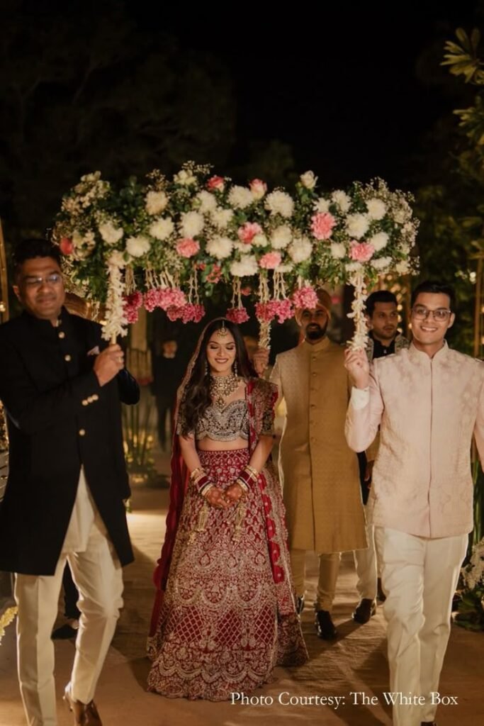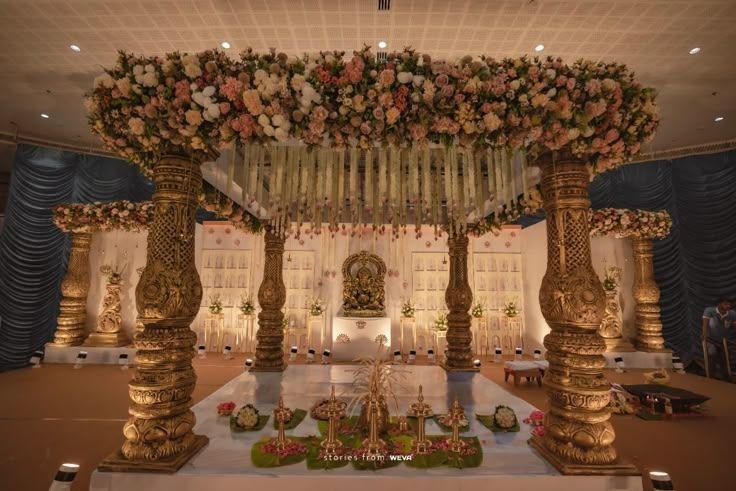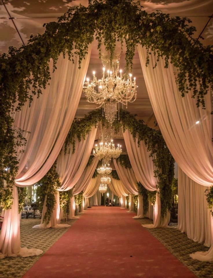 Transform your venue with hanging flowers and chandeliers for a royal look.